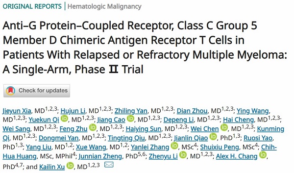 接纳该项手艺医治多发性骨髓瘤的严重医学功效已被国际顶级学术期刊《Journal of Clinical Oncology》(影响因子50.717)领受颁发:Anti–G Protein–Coupled Receptor, Class C Group 5 Member D Chimeric Antigen Receptor T Cells in Patients With Relapsed or Refractory Multiple Myeloma: A Single-Arm, Phase Ⅱ Trial1。该研讨接纳国际抢先的GPRC5D CAR-T细胞医治手艺,胜利医治了33例复发难治性多发性骨髓瘤患者,并获得91%的总反映率(ORR)的优良疗效。此中,在既往接管过 BCMA CAR-T细胞医治的9例患者中,反映率为100%。